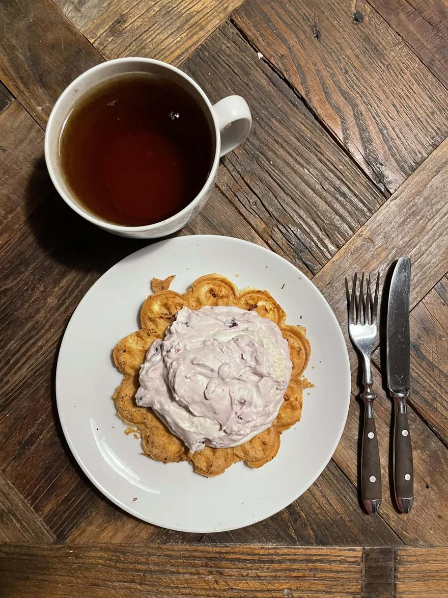 Og en chaffle med flødeskum, hvor jeg rørte proteinpulver med vaniljesmag i.